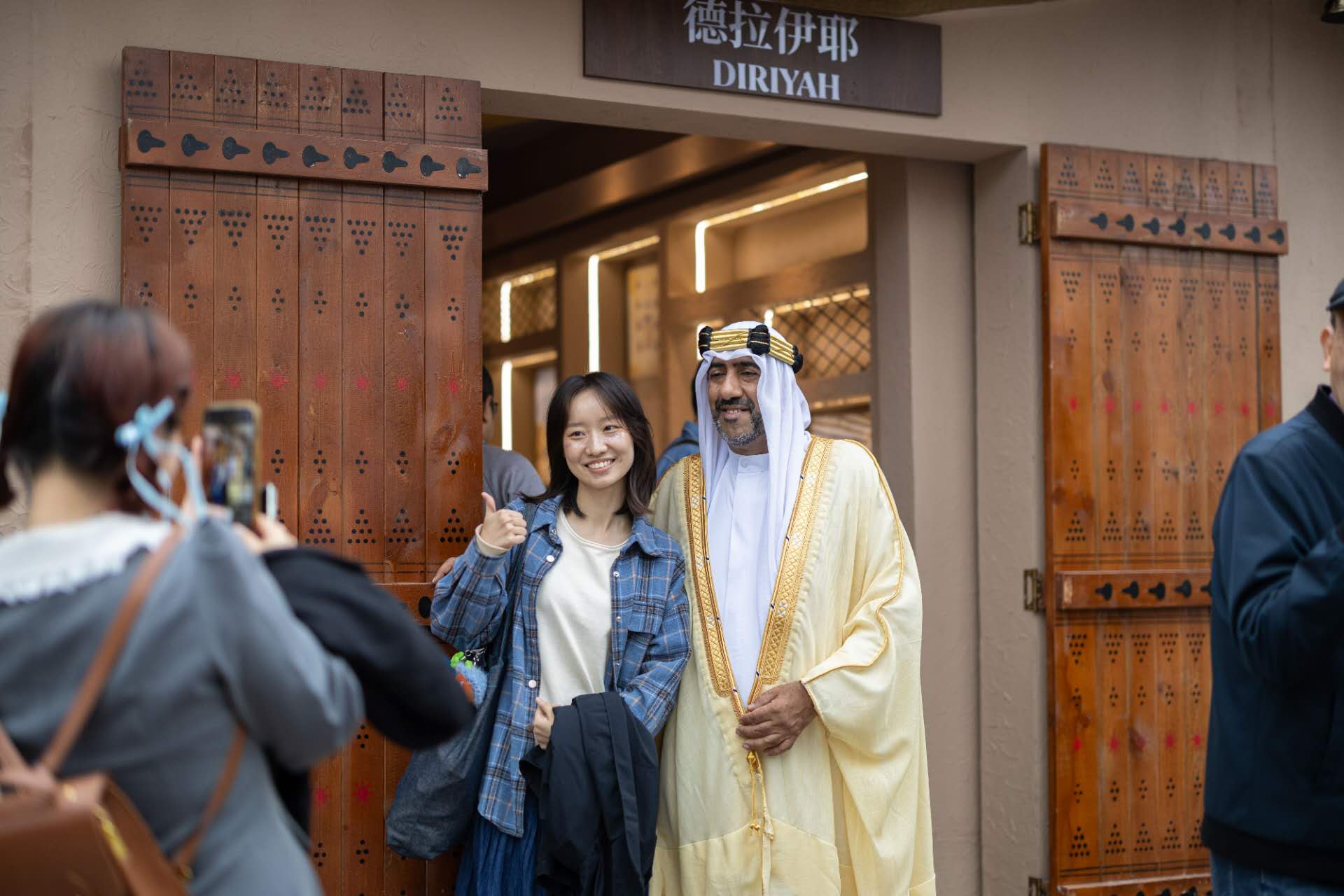 在德拉伊耶展区,泥砖古城被“搬”到了现场——德拉伊耶是沙特第一王朝的发源地,其核心区域图拉伊夫被联合国列为世界文化遗产。在这里,沙特人身穿比什特工艺(Bisht Craft)制成的传统长袍,热情邀约每一位游客合影,向游客讲述这座王城背后的故事。“我们12月就要去沙特,今天先来‘预演’一下!”一对年轻夫妻兴奋地分享。