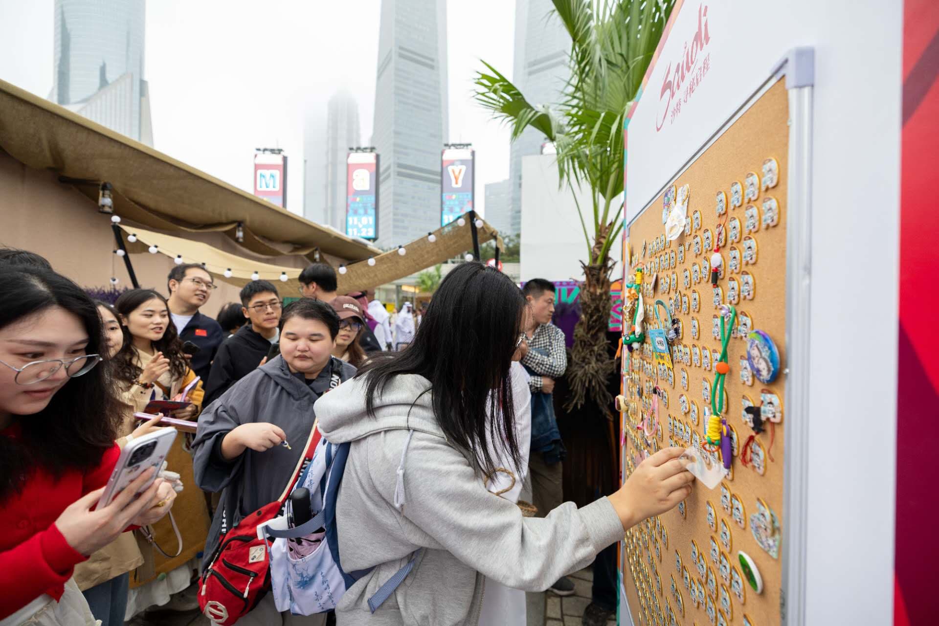 离场前,不少游客在徽章交换区排起小队——只要自带一枚徽章,即可免费兑换限量版“熊猫胖胖”主题徽章。该系列共六款,涵盖吉达、利雅得、埃尔奥拉、德拉伊耶、红海与沙特主题,每日限量750枚,先到先得。现场还可扫码参与互动,领取沙特骆驼、小海龟等特色玩偶,延续这场阿拉伯奇遇的记忆。