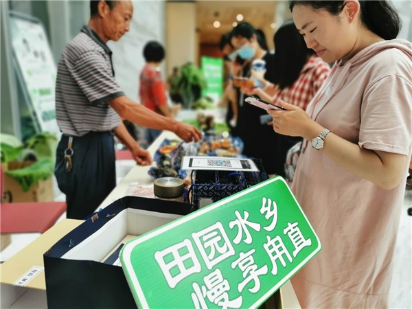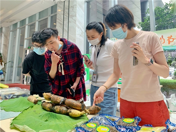 当日,甪直好看又好吃的各类特产,在同程大厦一楼售货摆摊,员工们闻讯而至,争相购买,甪直酱品厂的萝卜、营养丰富的水八仙、白净香郁的甪直大米、精致且具有象征意义的端端文创礼品等等,承载着甪直历史沉淀与现代创新的商品,谁人不爱?
