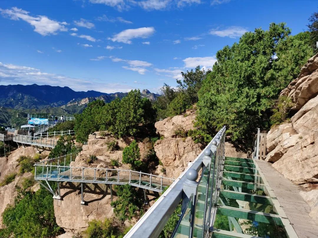 清凉谷玻璃栈道,像一条透明的小游龙,盘在悬崖峭壁之上,走在上面,可以看山峦起伏,绿野葱葱,秀美景色尽收眼底。