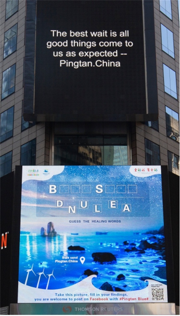 即便是现在,时代广场仍然是每天数万人与车的必经之路,其中不乏很多在疫情中依然身居要职的世界各地公民,包括医护人员、媒体人员、执法人员、药店工作人员等等。平潭国际旅游岛,一个拥有着“蓝眼泪”自然奇观的浪漫之地,一个令人心生美好向往的奇“愈”之地。 在这个特殊的时间与空间,平潭国际旅游岛希望通过时代广场标志性的路透大屏,借以平潭最具代表性自然生态景观——“蓝眼泪”所寓意的幸运与美好,为全球民众带来蓝色力量与美好治愈,传达平潭来自蓝色生命色的希望和期许。