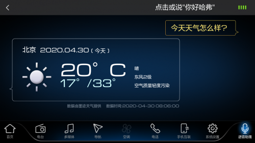 同时,哈弗H6运动版还能和你语音互动,其搭载的智能互联系统集成了语音识别功能,基于定制化的科大讯飞语音助手3.5系统打造而来,可通过语音控制多媒体、导航、空调、电话等,并且还能查询火车票、航班、天气等信息。重要的是,它还支持全局免唤醒,例如“我想查询北京的天气”,系统就会语音播报天气情况。