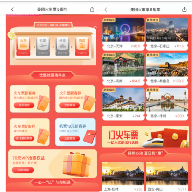 记者浏览美团火车票5周年活动页面发现除了有火车票新客券、818当天限时领取818券,抽取5000元出行奖金、火车票免单神券等各种优惠之外,还针对不同用户的坐标城市智能推荐周边游热门火车线路,让旅行说走就走。