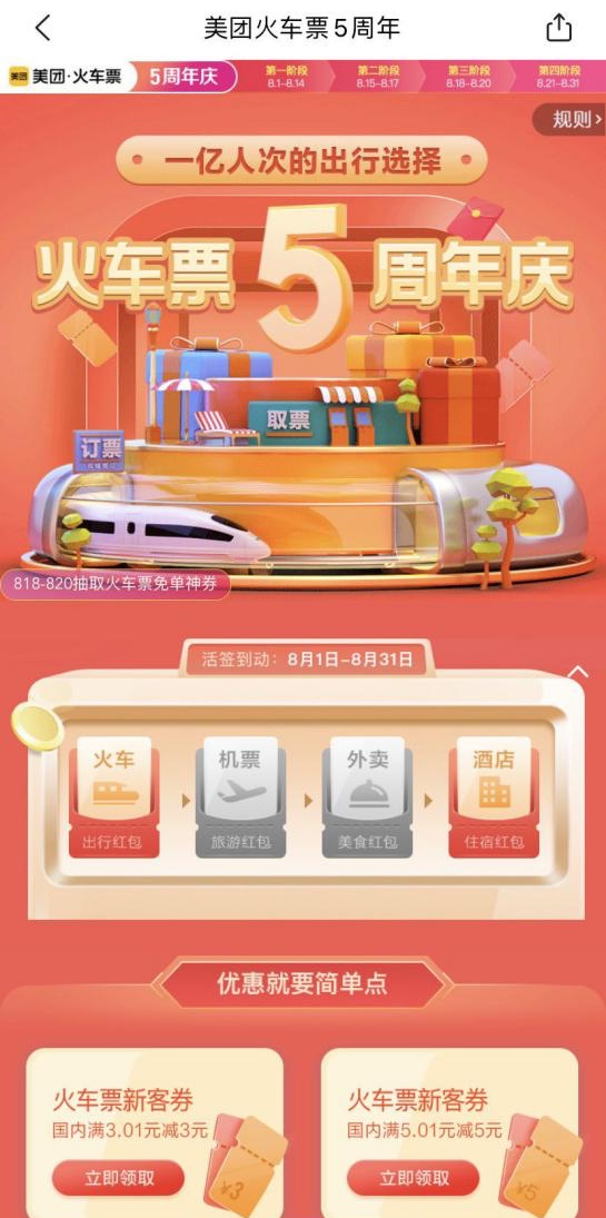 美团火车票5周年庆送出行红包 累计为一亿人次提供出行服务