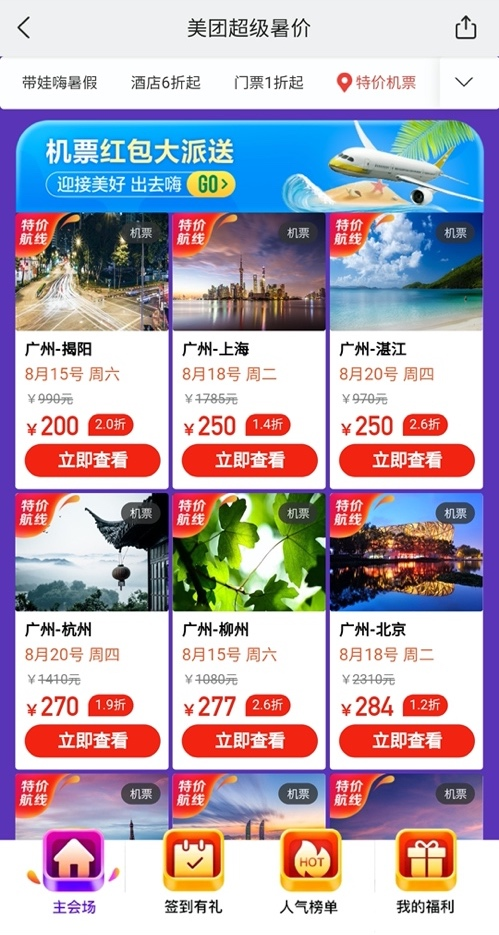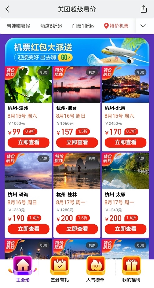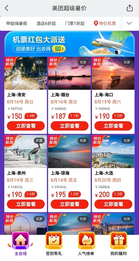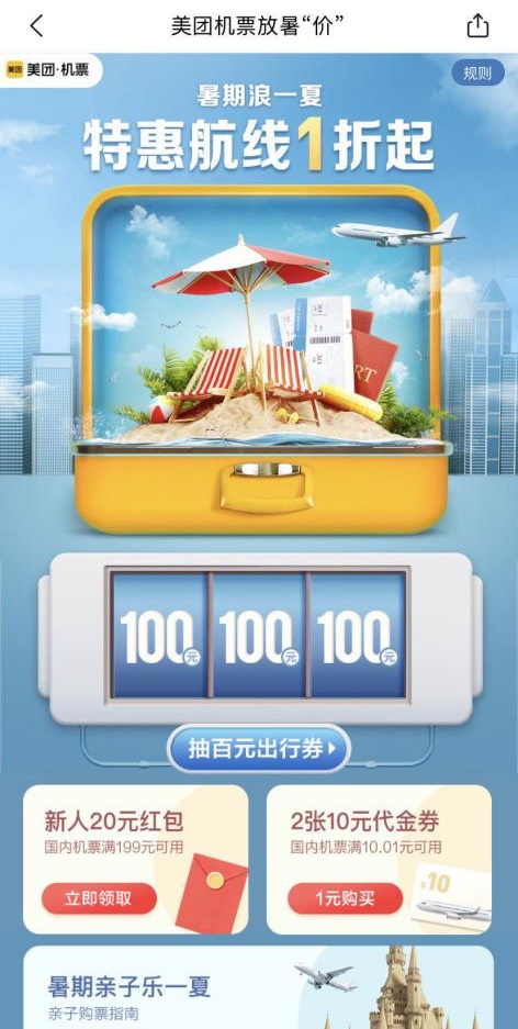 美团超级暑“价”特价机票一折起 机票红包叠加使用折上折